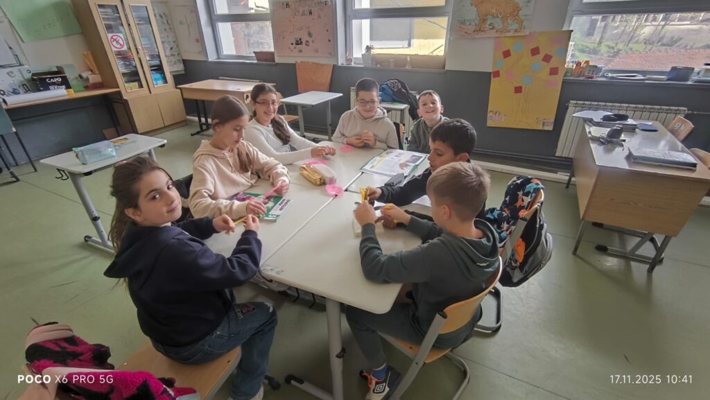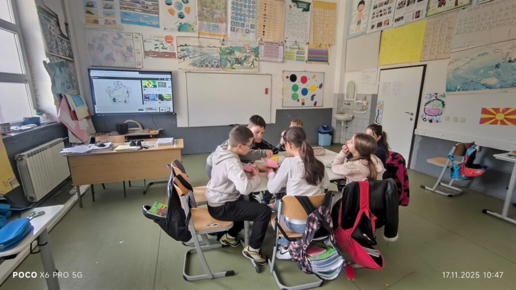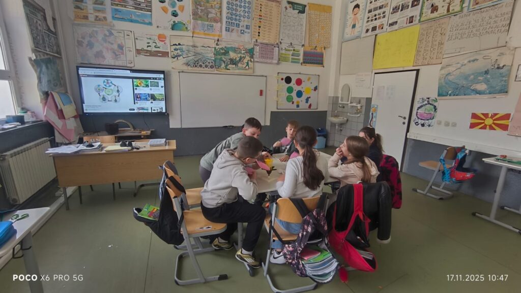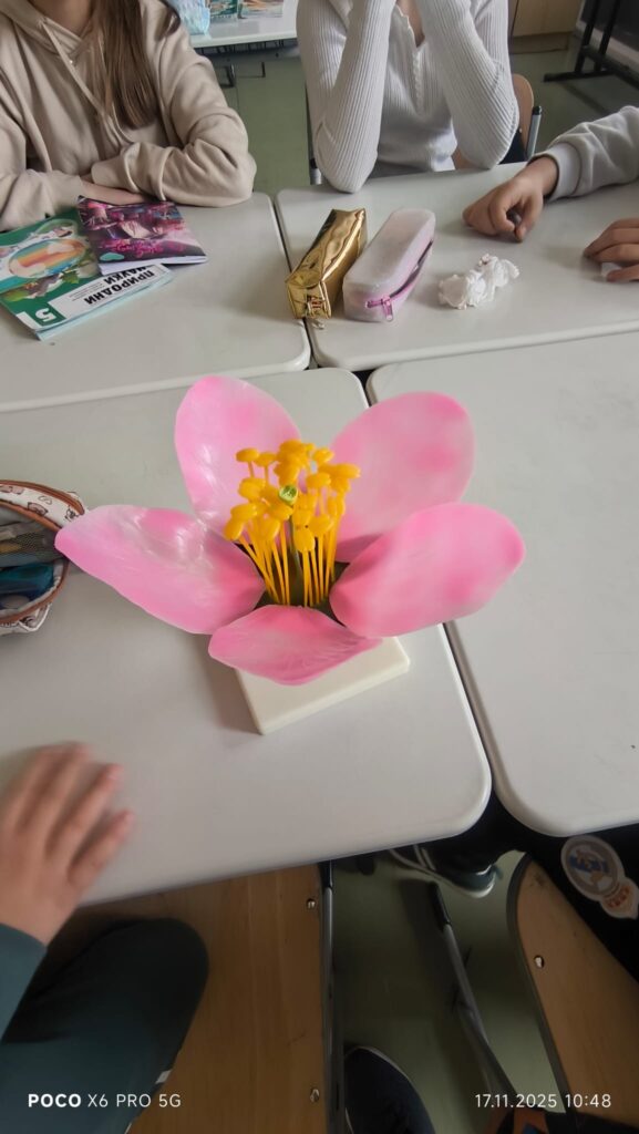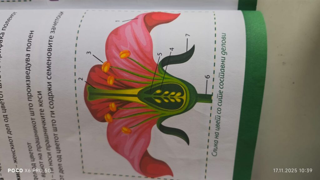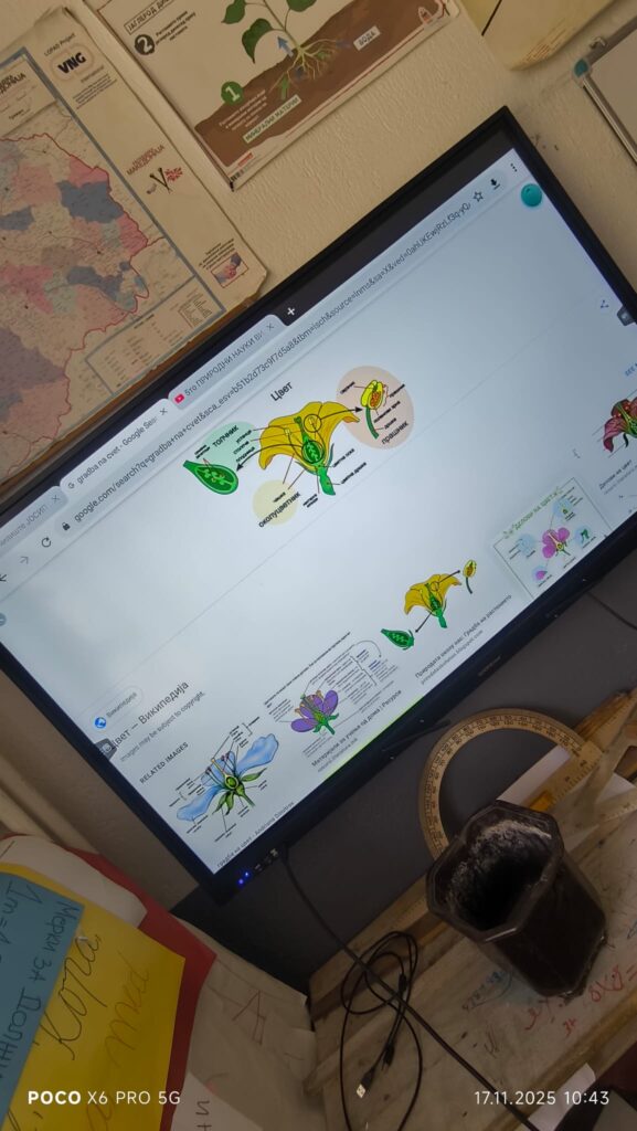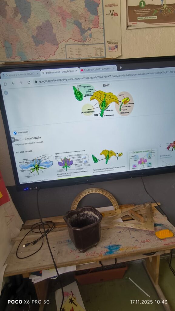 На часот учениците преку интерактивна табла и 3D модел на цвет ја изучуваа градбата на цветните растенија. Учениците работеа како една група и ги идентификуваа основните делови на цветот: ливчиња, прашници, полен, толчник и плодник, и учеа за тоа како се случува опрашувањето.