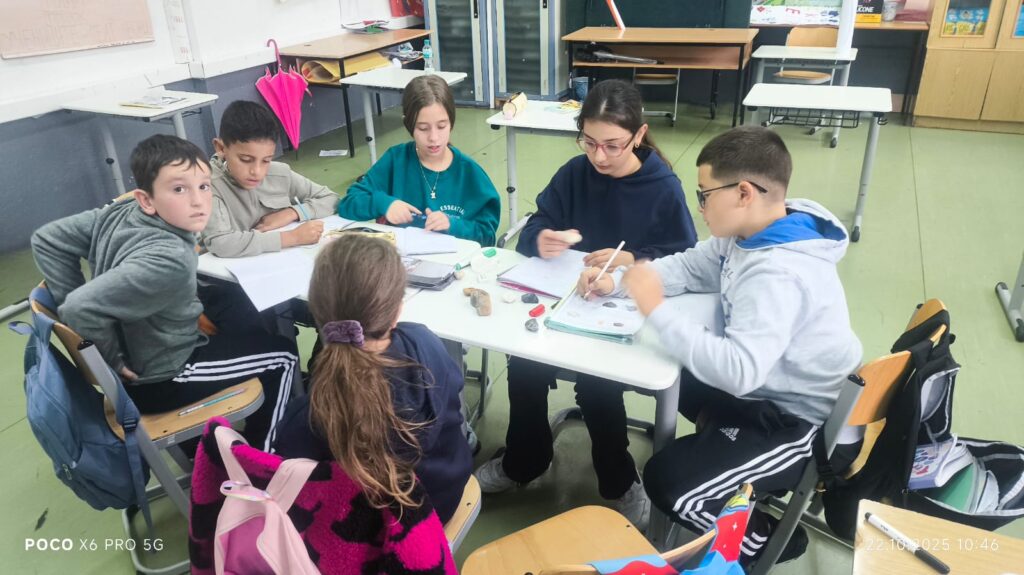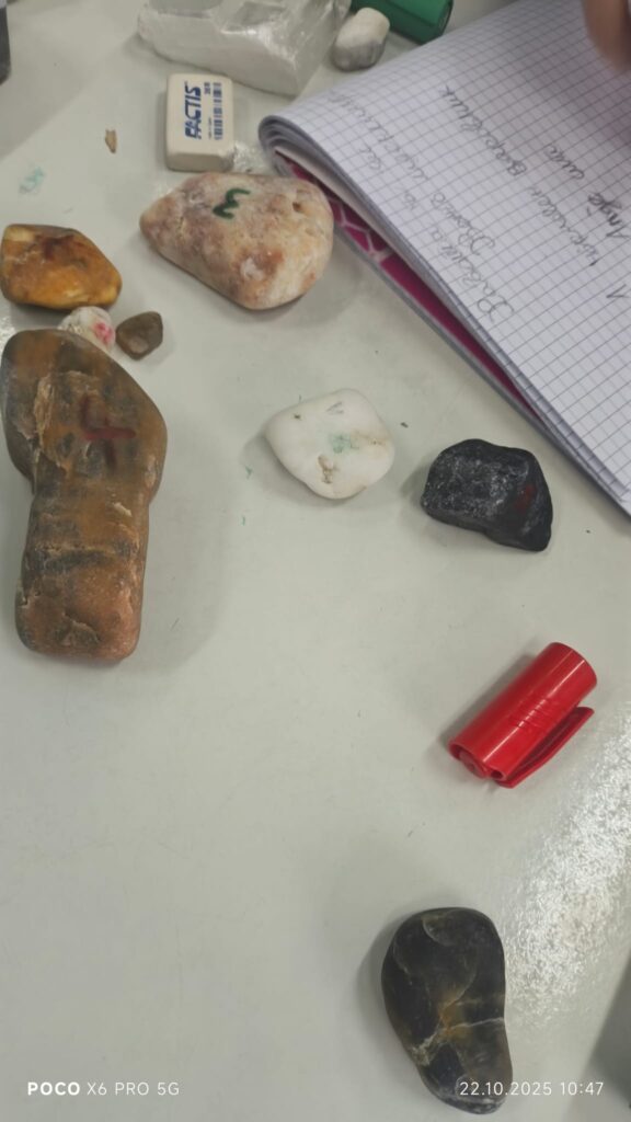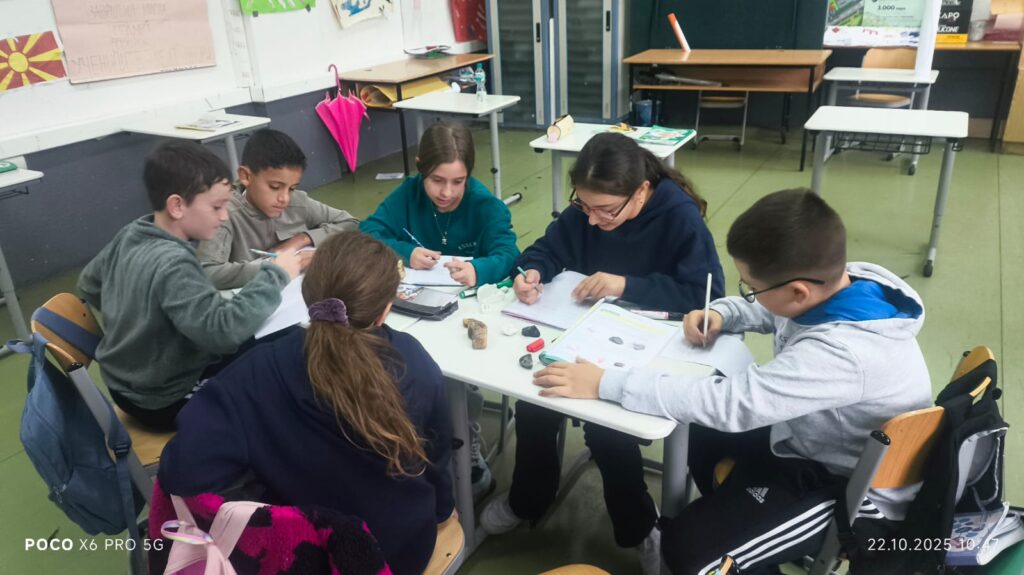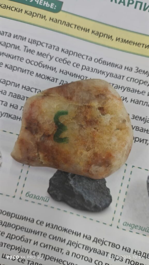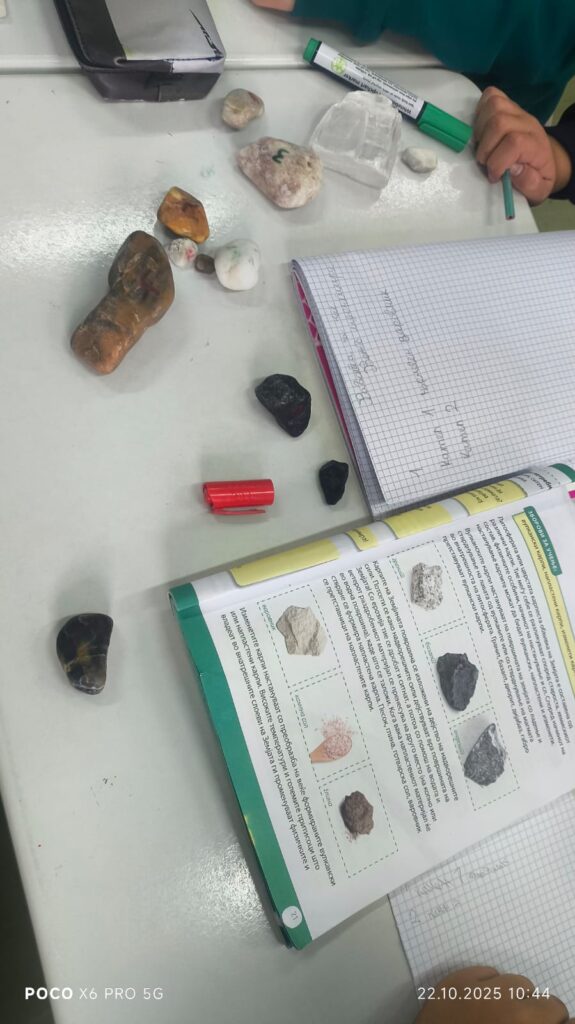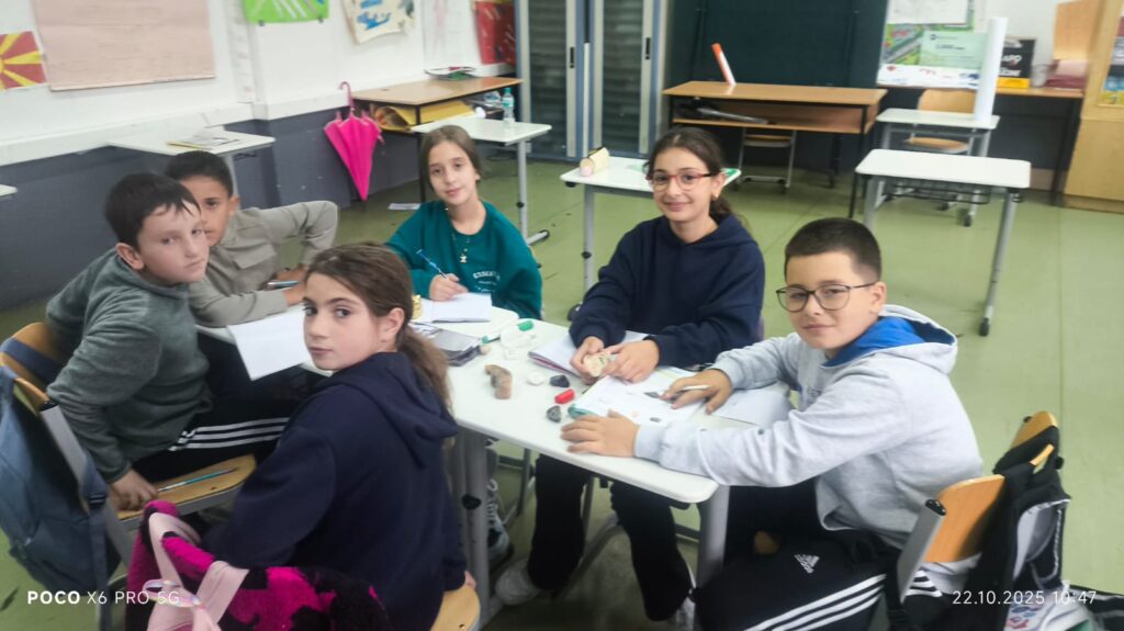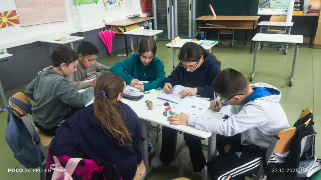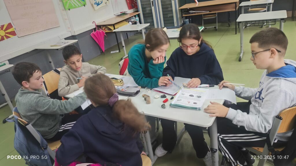 Во рамки на часовите по природни науки, со учениците од 5 одделение реализиравме интерактивна групна активност за препознавање и идентификација на различни видови карпи. Учениците работеа во мала група, при што добија сет од различни примероци на карпи – магматски (како базалт), седиментни, и метаморфни.